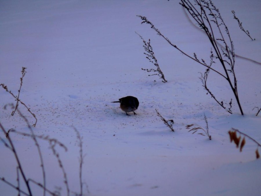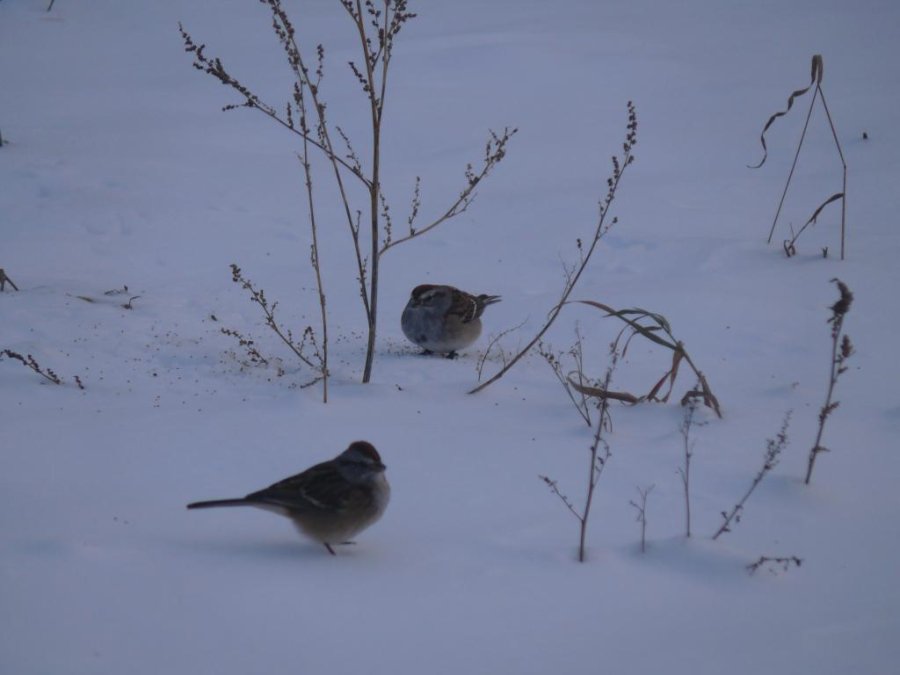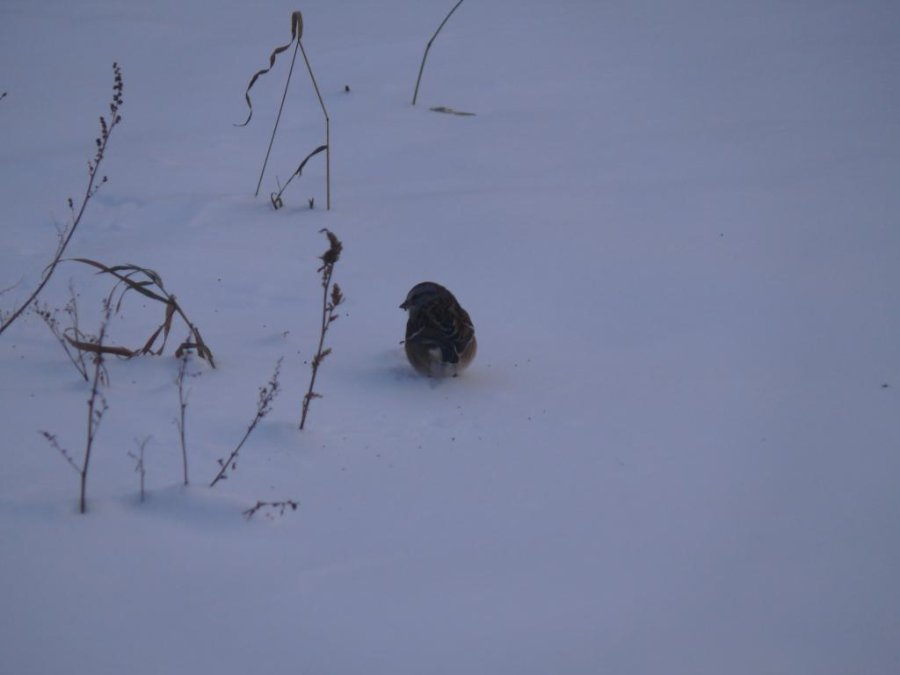 Le marais devant chez moi est gelé. Des rats musquées ont commencés à faire leurs huttes dans des zones de marais, les oies sont encore là ainsi que quelques garrots à œil d’or. Des bruants hudsoniens, peu farouches, animent les abords de la maison. Je prépare les raquettes pour aller faire de la photo sous peu.