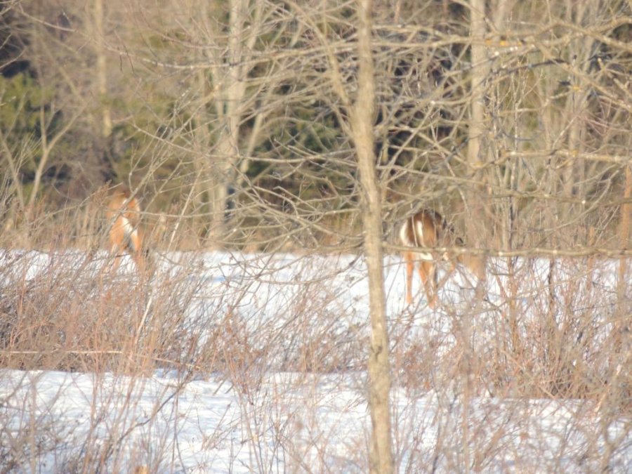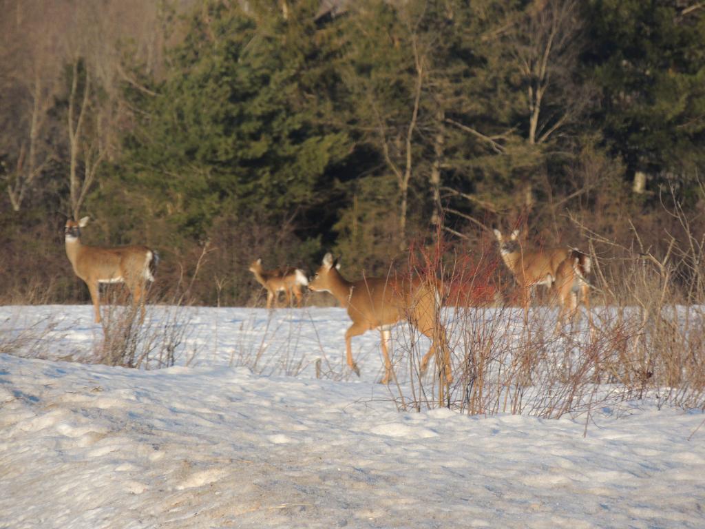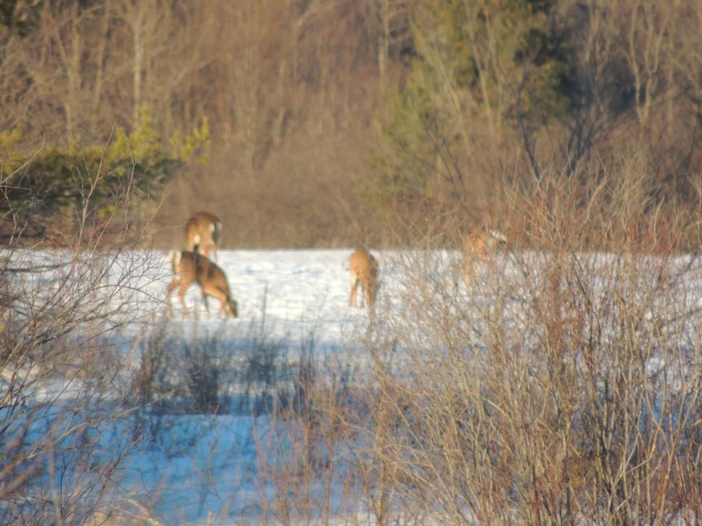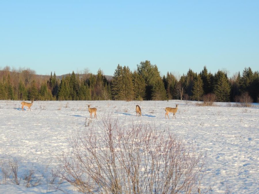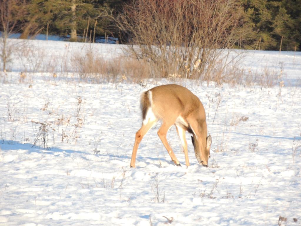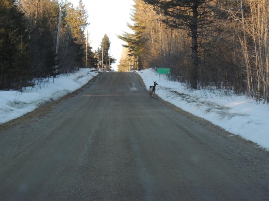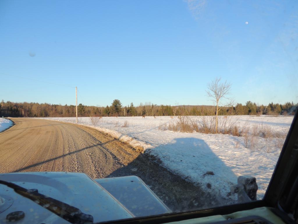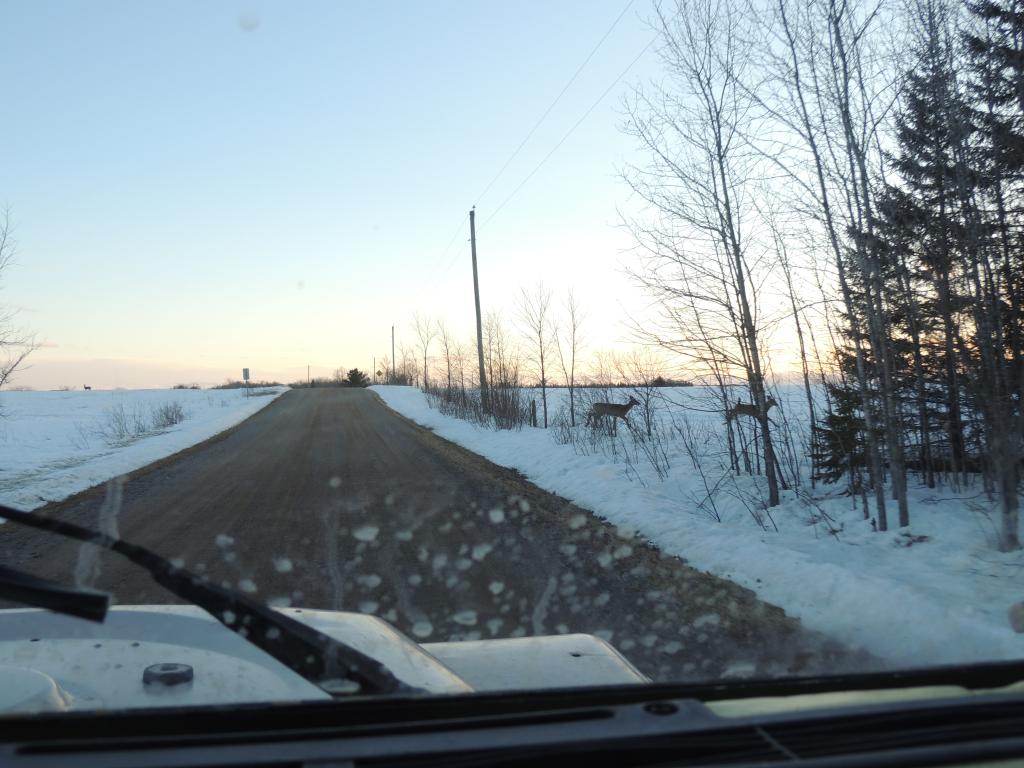 On en a vu gratter la neige pour trouver à manger. On en a vu dans des cours de ferme manger les balles de foin stockée pour les vaches ou dans des parcs manger le foin des chevaux. Ils sont affamés, ils ont perdus toute prudence. L’hiver à été très dur, il y avait beaucoup de neige. Elle a en grande partie fondue. On en a vu un écrasé sur le bord de route, il était très maigre.