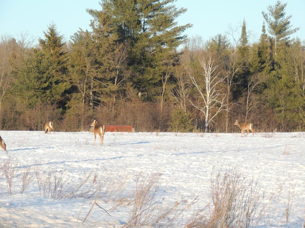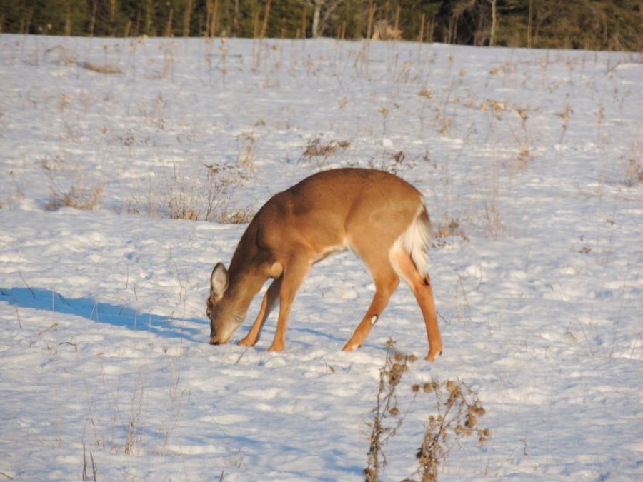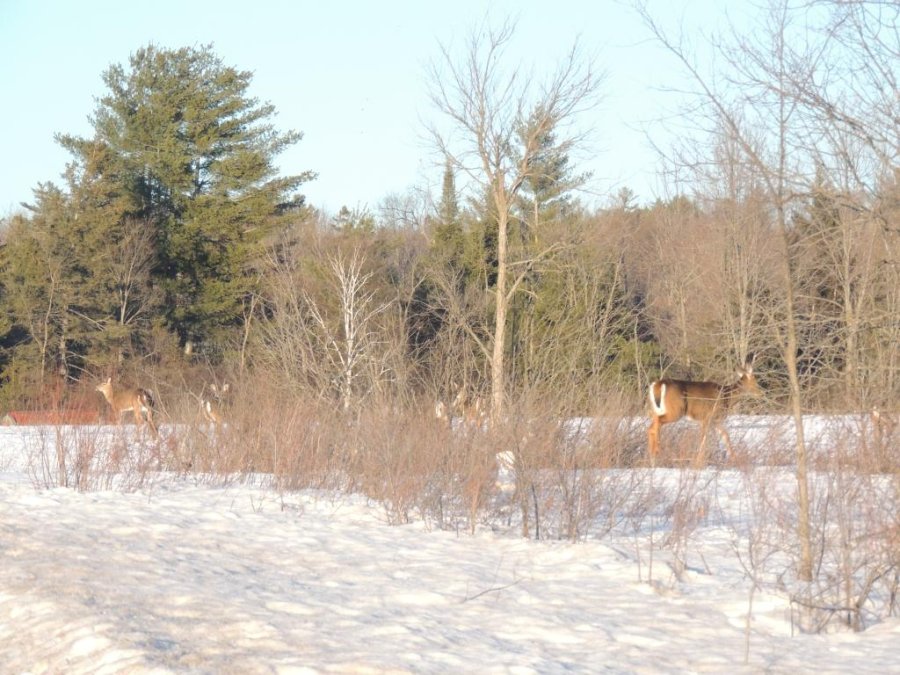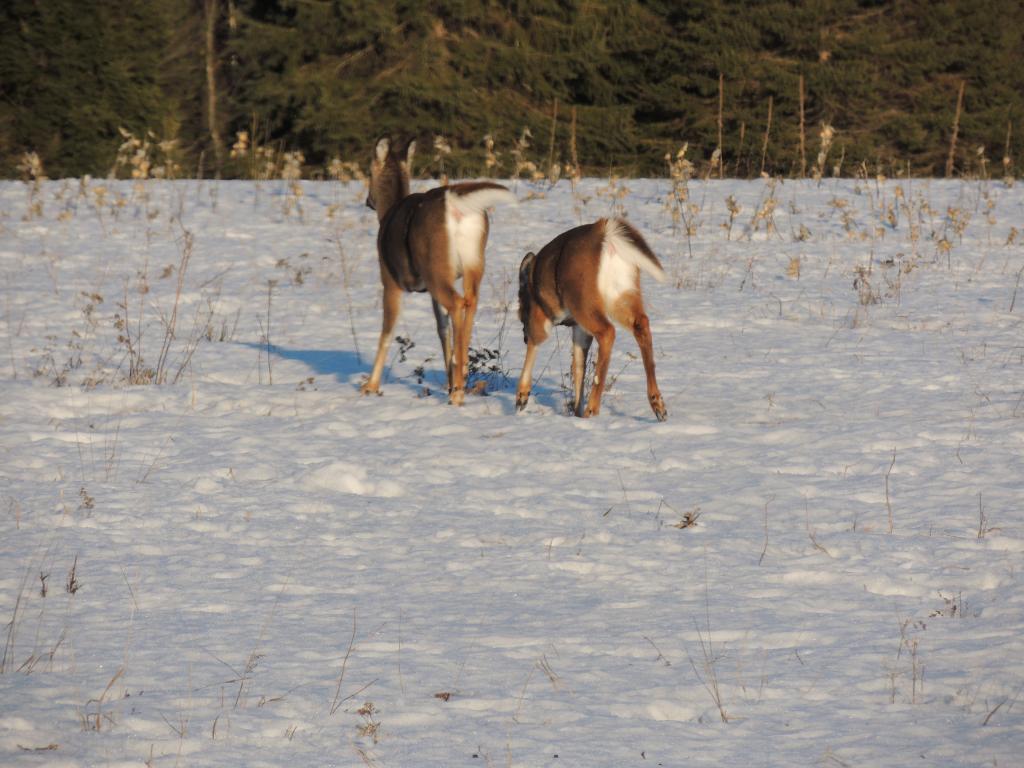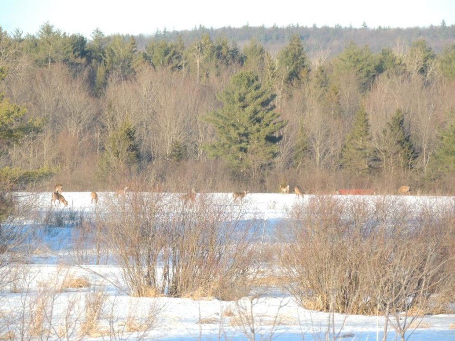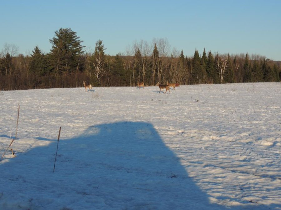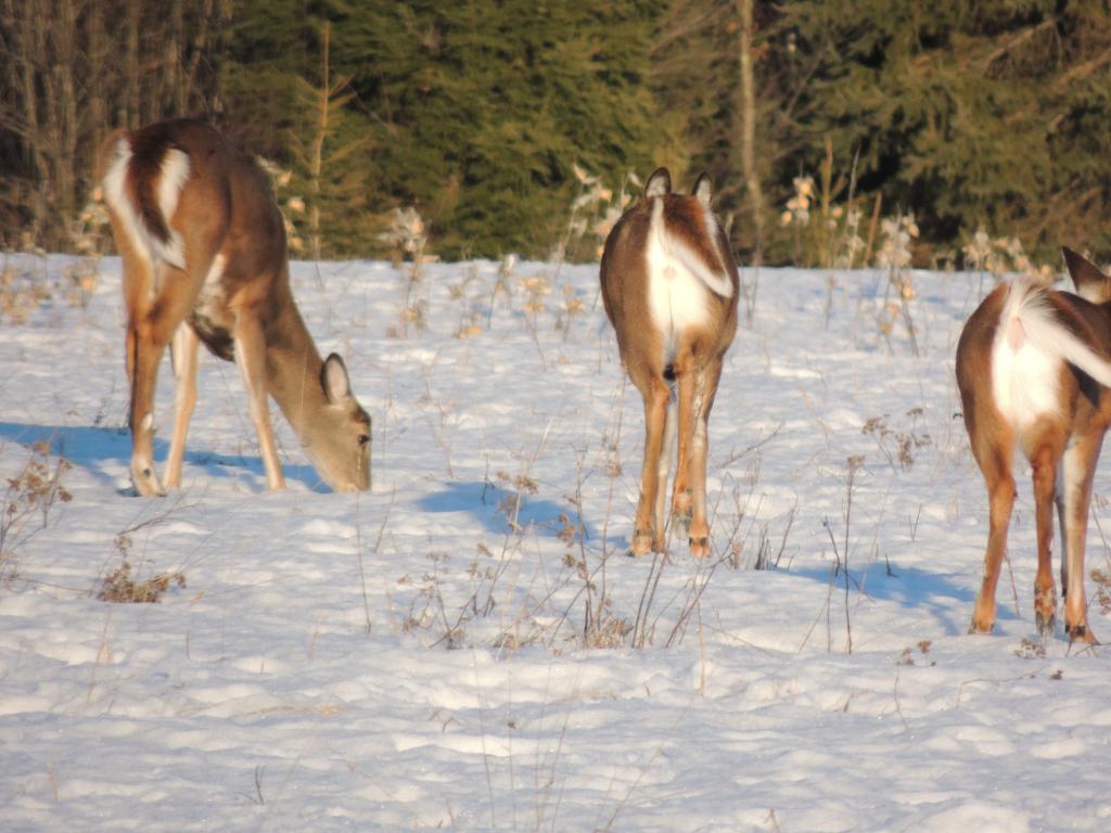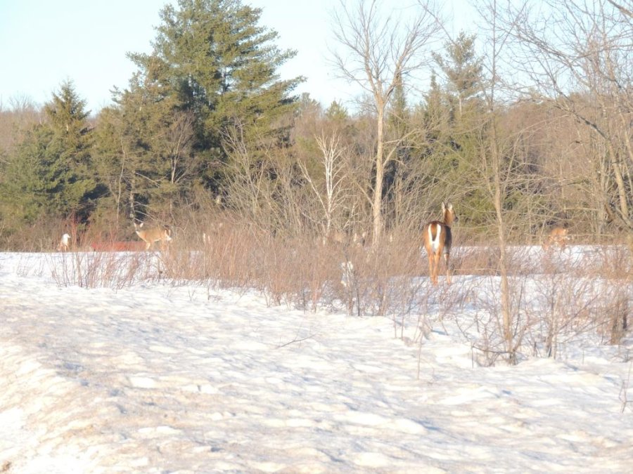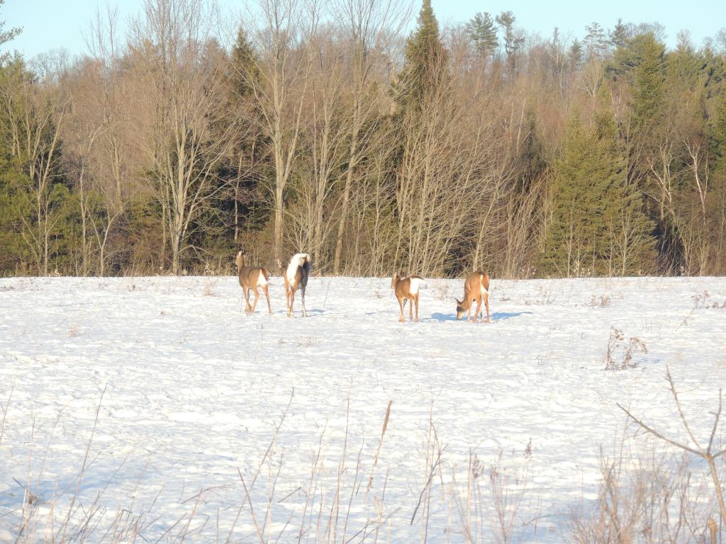 On en a vu gratter la neige pour trouver à manger. On en a vu dans des cours de ferme manger les balles de foin stockée pour les vaches ou dans des parcs manger le foin des chevaux. Ils sont affamés, ils ont perdus toute prudence. L’hiver à été très dur, il y avait beaucoup de neige. Elle a en grande partie fondue. On en a vu un écrasé sur le bord de route, il était très maigre.