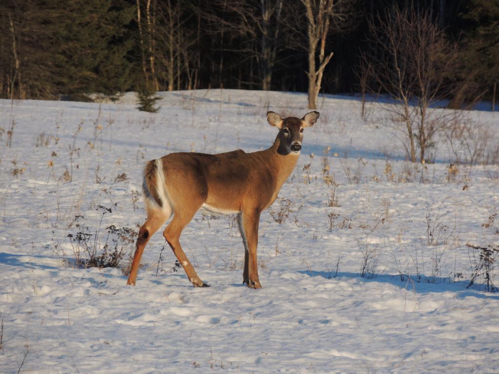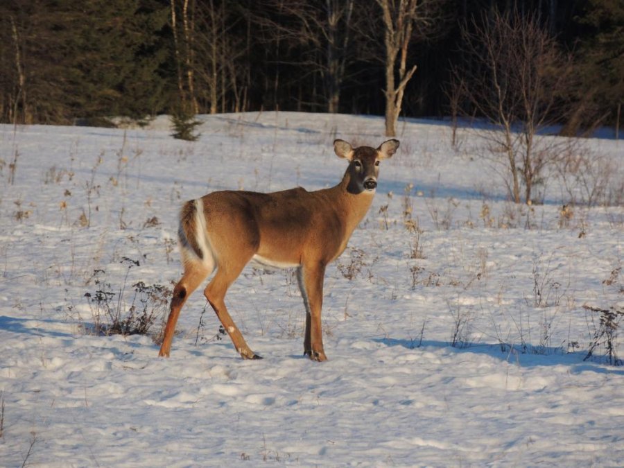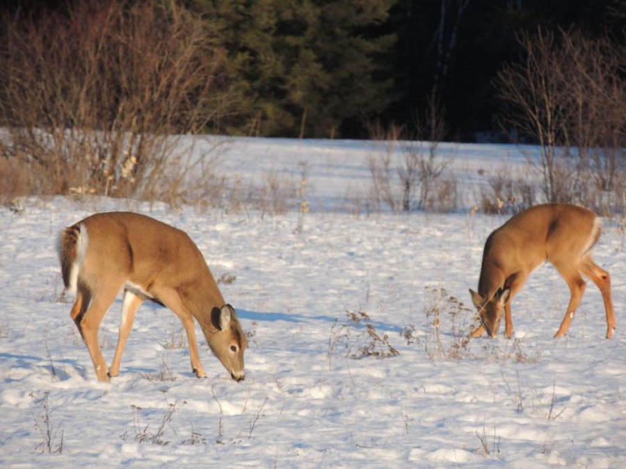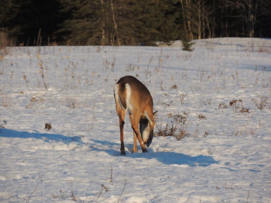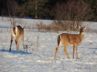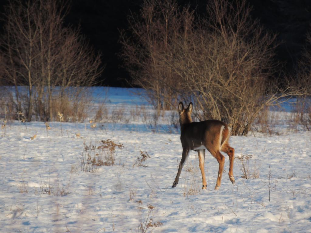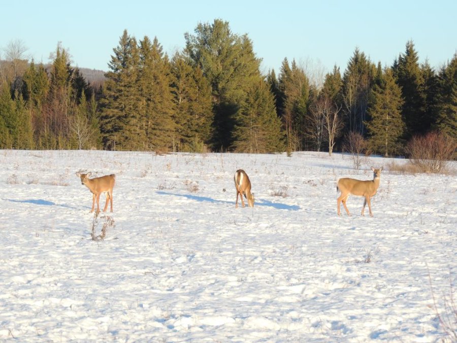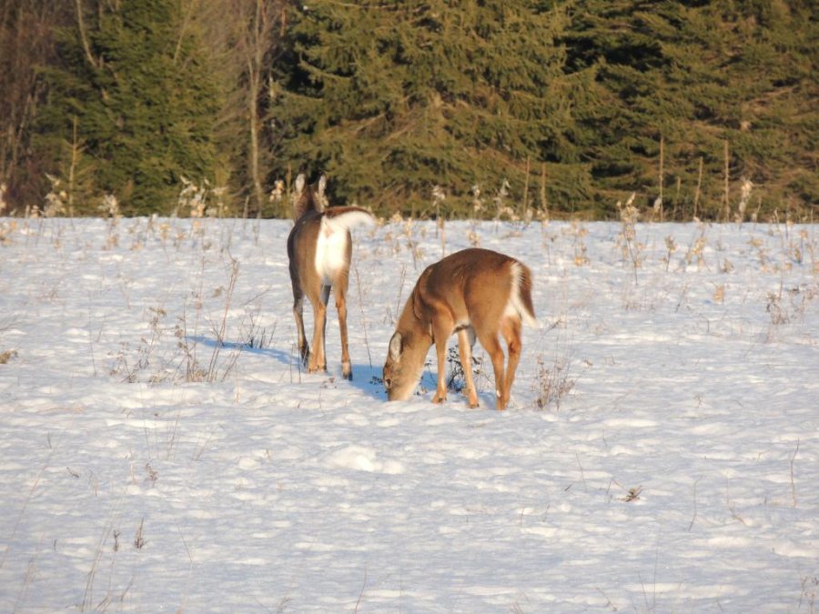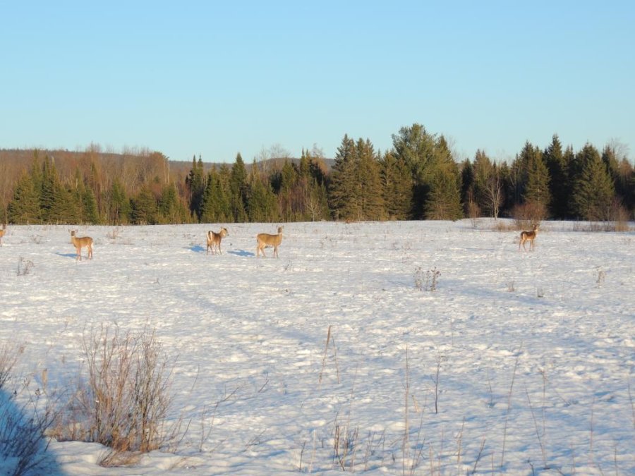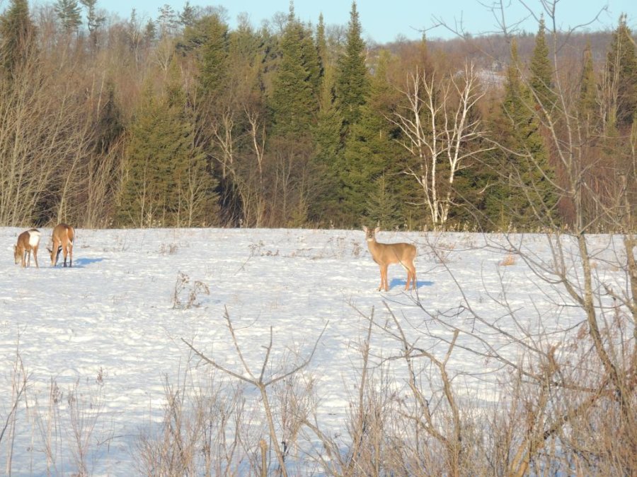 On en a vu gratter la neige pour trouver à manger. On en a vu dans des cours de ferme manger les balles de foin stockée pour les vaches ou dans des parcs manger le foin des chevaux. Ils sont affamés, ils ont perdus toute prudence. L’hiver à été très dur, il y avait beaucoup de neige. Elle a en grande partie fondue. On en a vu un écrasé sur le bord de route, il était très maigre.