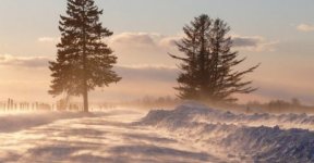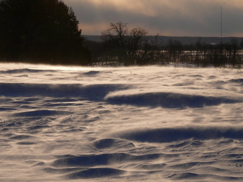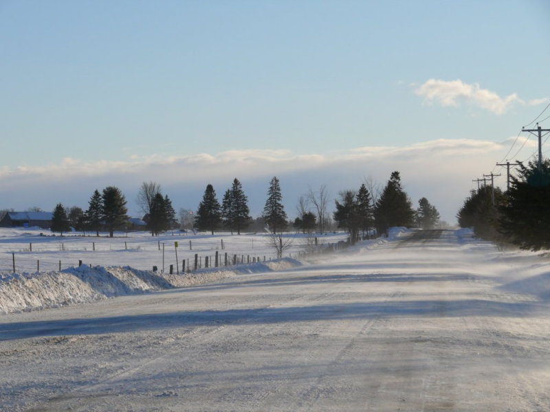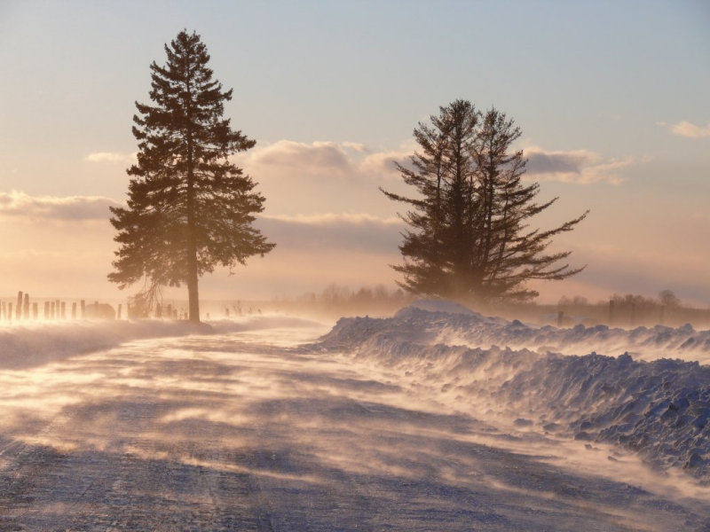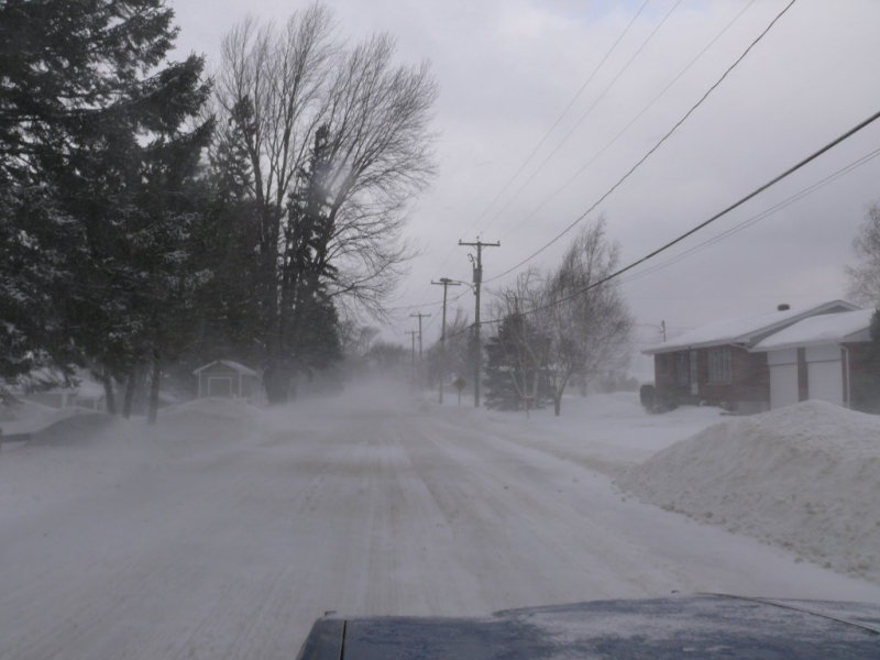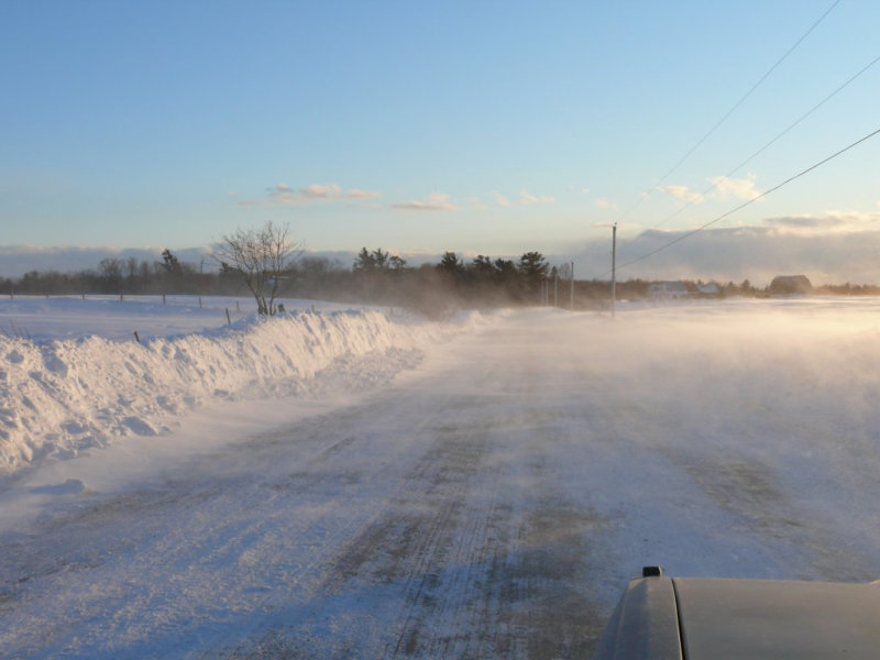Le vent souffle en tempête et soulève de la poudrerie, les routes sont envahies de neige dans les couloirs venteux.