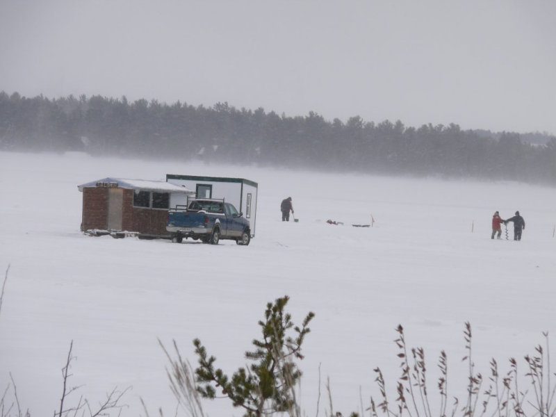 Malgré le vent glacial des passionnés de pêche forent la glace pour poser leurs lignes.