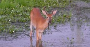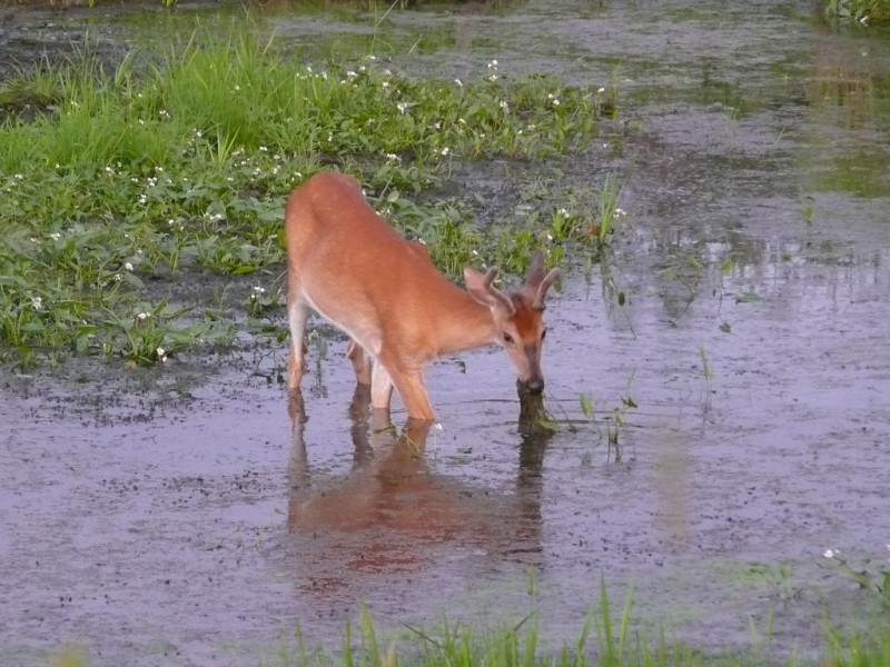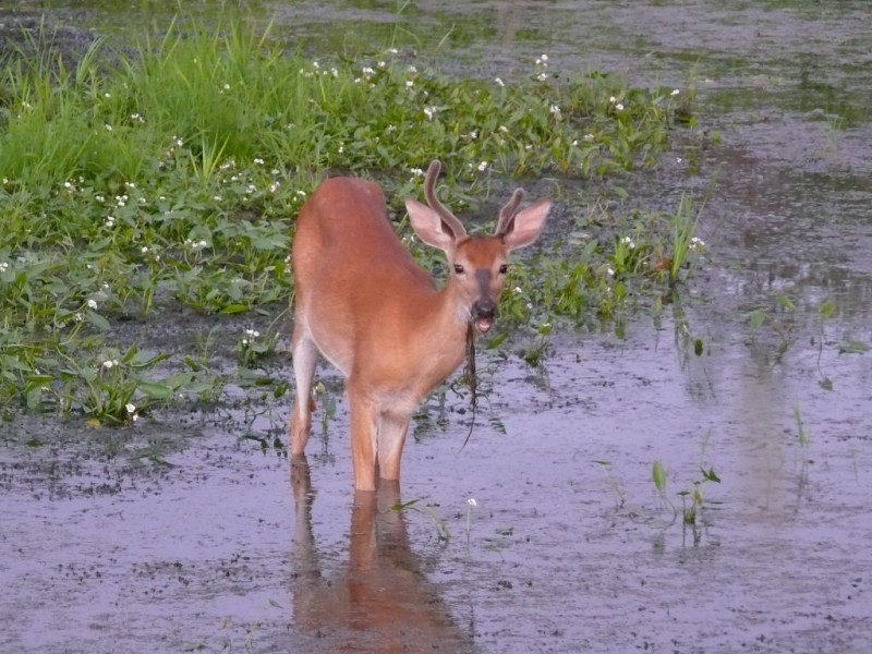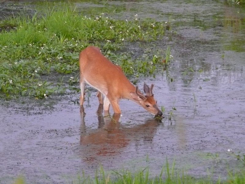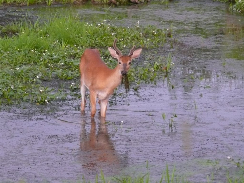 Cerf du Virginie qui broute des plantes aquatiques dans un petit ruisseau à 5 min à pied du Val à l’âne.