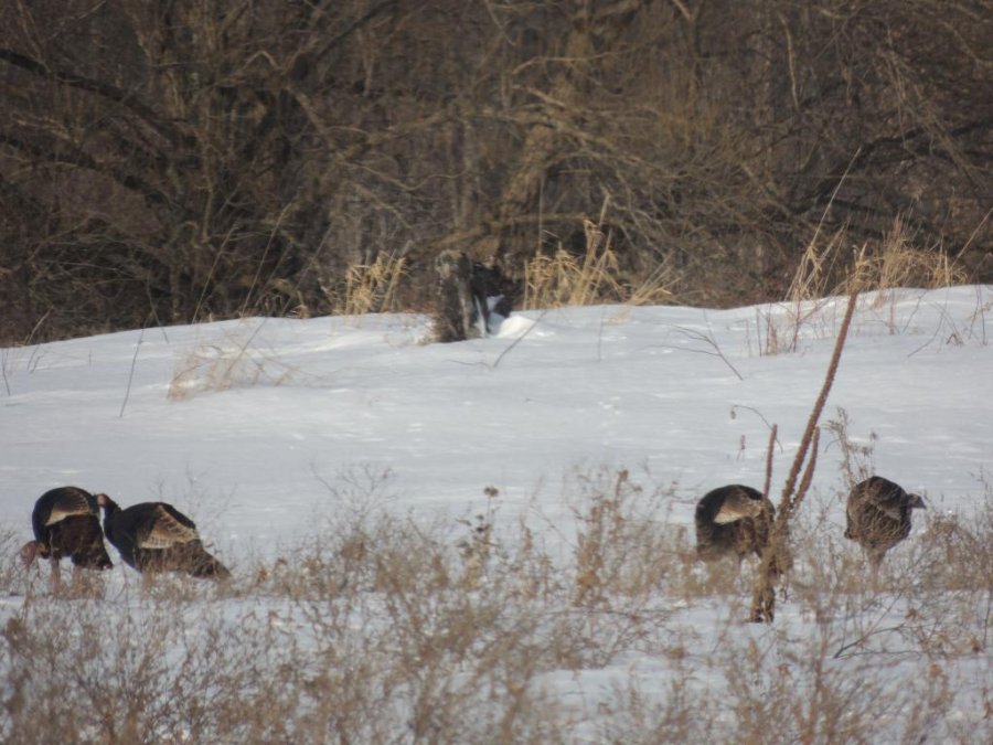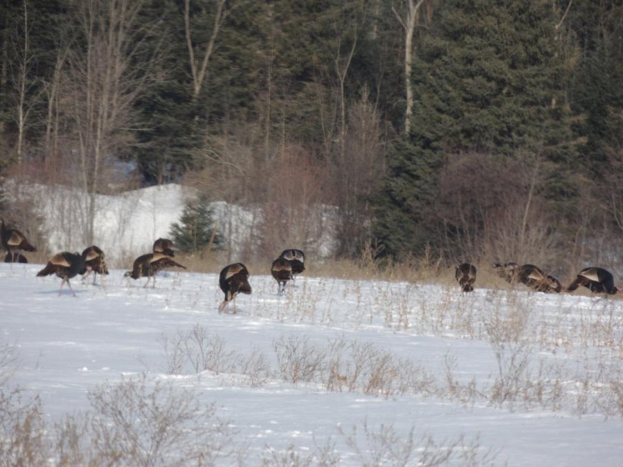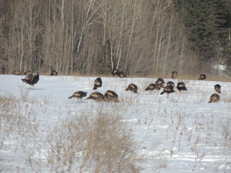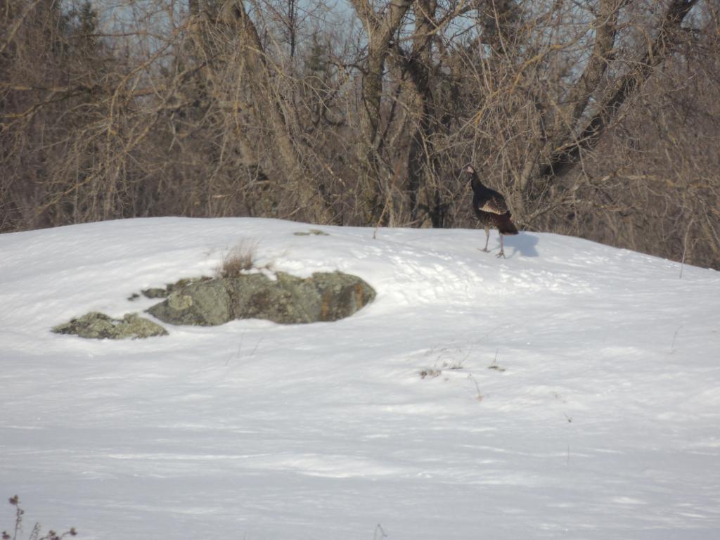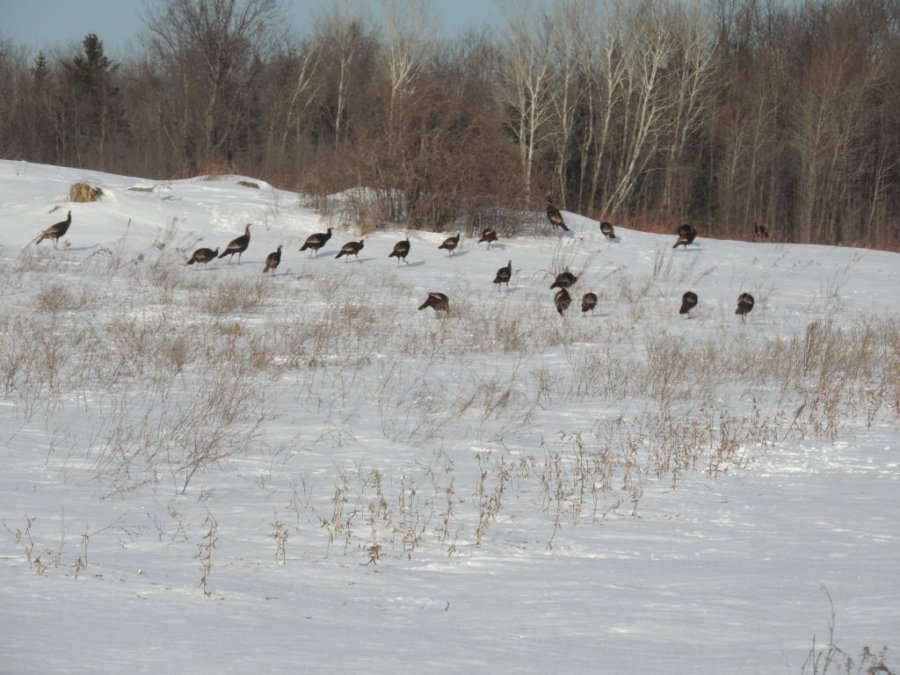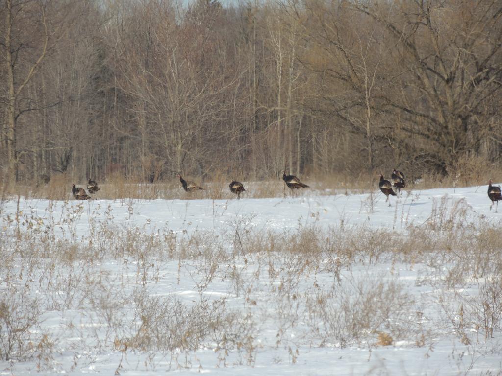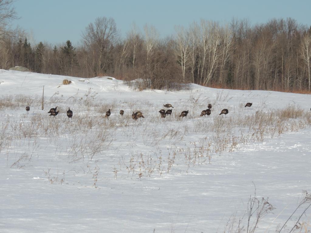 Comme il faisait beau, nous avons pris des petits chemins de campagne. On a tout d’abord croisé une bande de dindons sauvages de taille peu courante, ça fait longtemps que je n’en ai pas vu autant. j’en ai compté autour de 80 mais comme une partie de la troupe était de l’autre coté d’une petite butte, il devait y en avoir au moins une centaine.