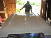Le ponçage a été fait avec une ponceuse avec du papier de 2000 je crois et une cale a poncer pour les endroits délicats. Puis un bon nettoyage et on a utilisé comme peinture de la corrostop blanc cassé appliquée au pinceau. Le lendemain, deuxième couche.