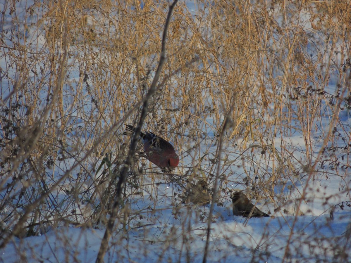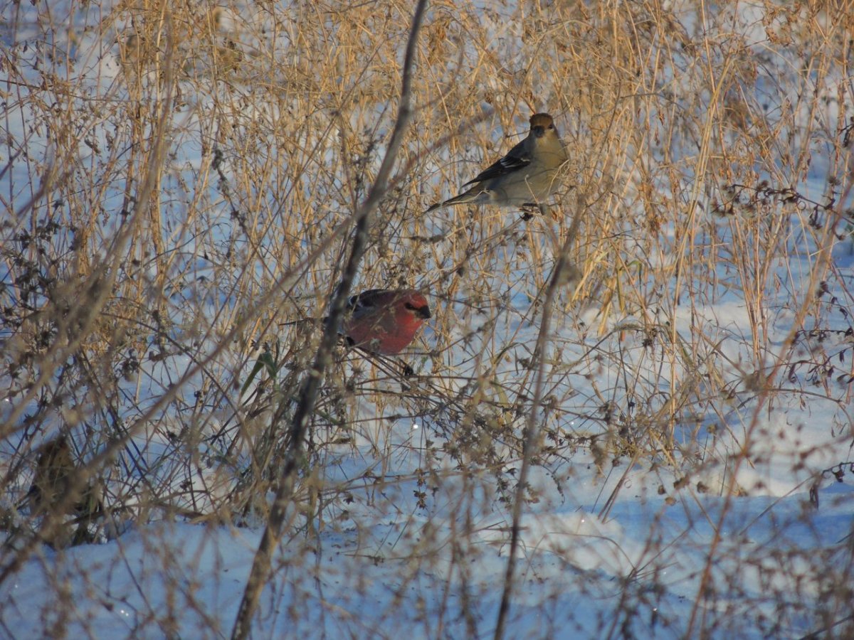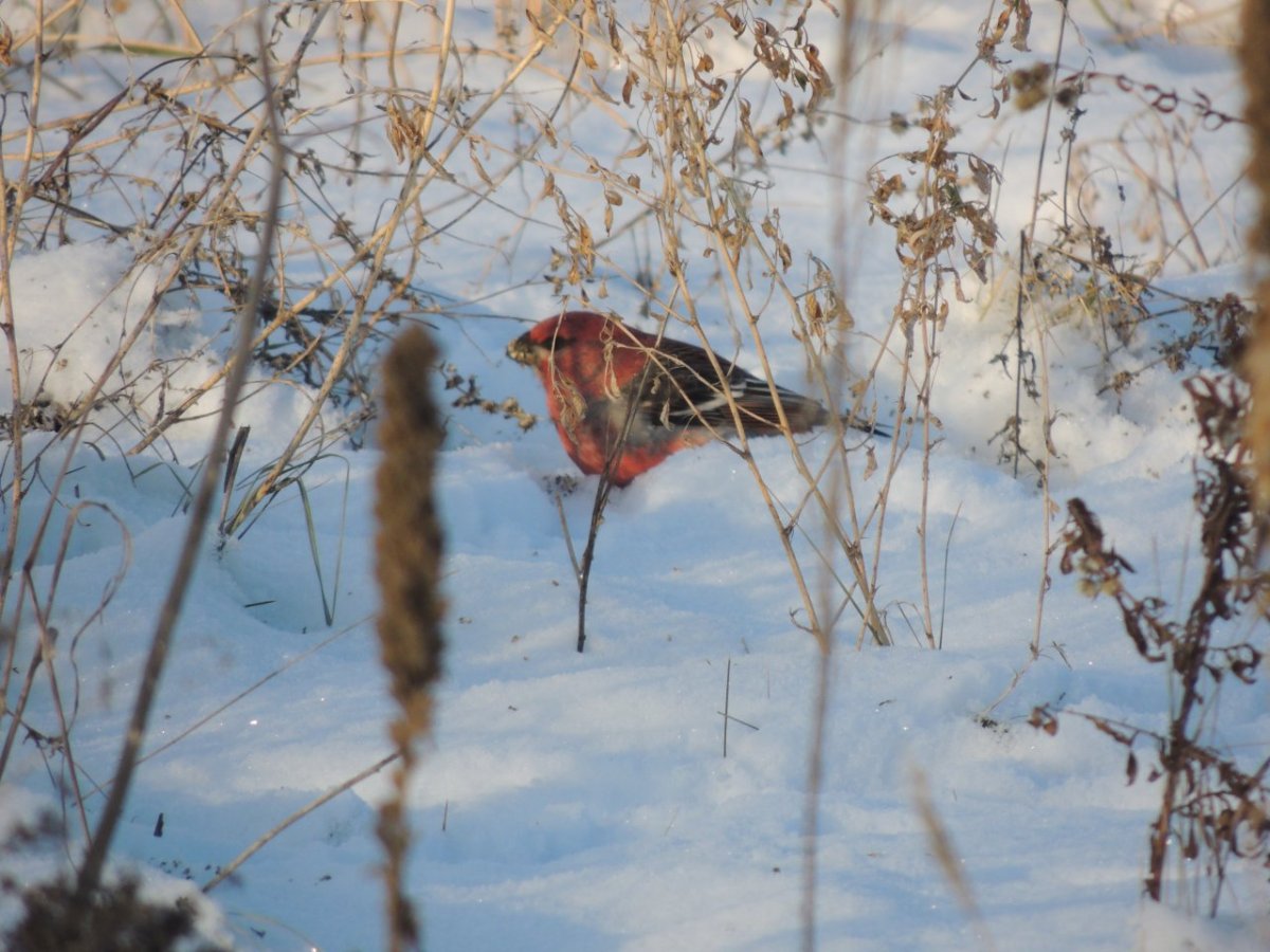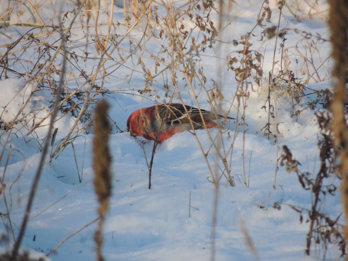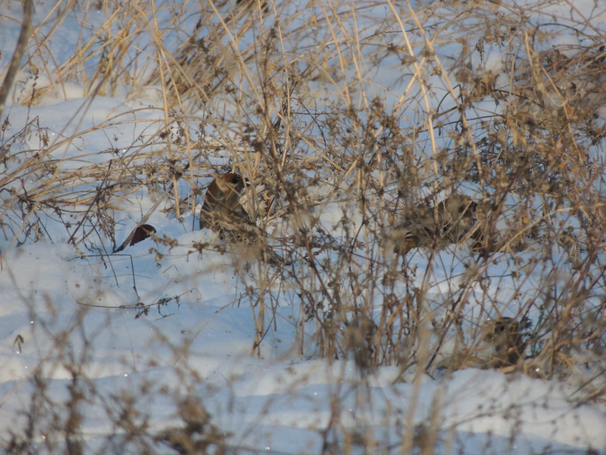 On marche sur le chemin lorsque l’on remarque quelques oiseaux colorés qui festoient sur le bord du chemin. Des herbes, des broussailles pleines de graines sortent de la neige. Ils picorent, creusent la neige, font des acrobaties, se bousculent pour se disputer leur pitance. J’ai fait quelques photos. Deux jours plus tard, plus d’oiseaux mais un rapace qui guette leur garde-manger pour se délecter de l’éventuel gourmand imprudent qui montrerait le bout de son bec…