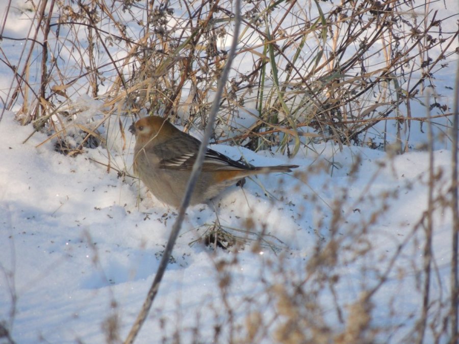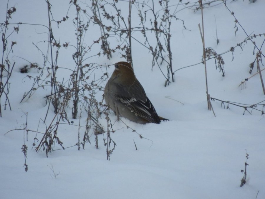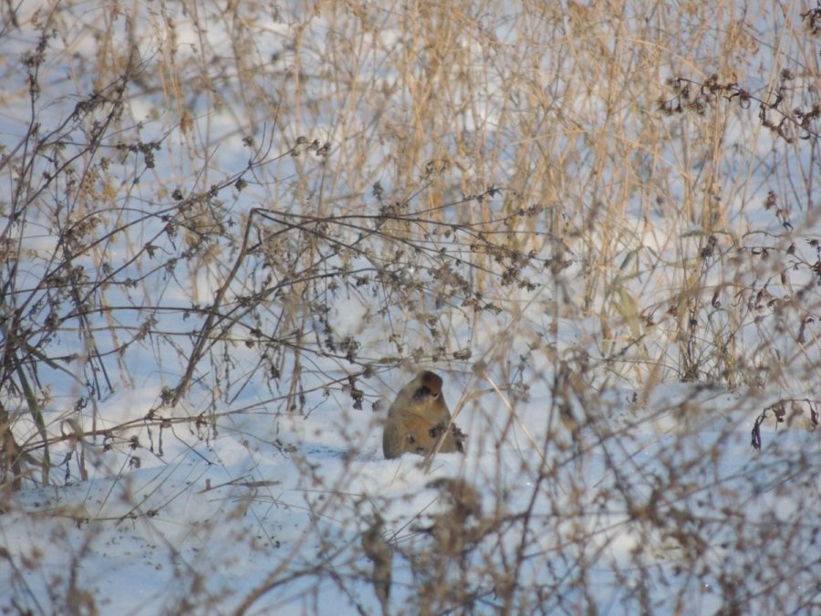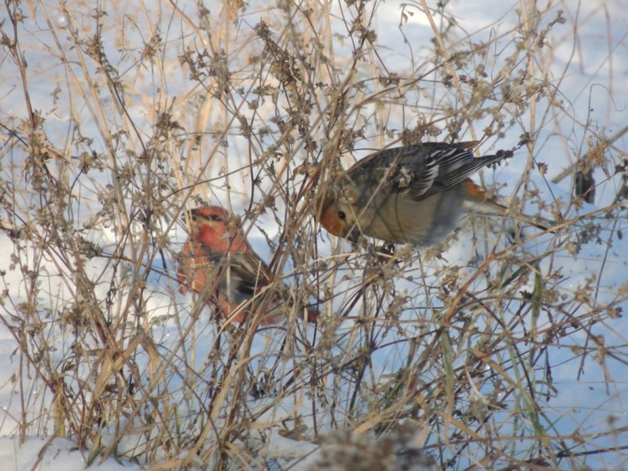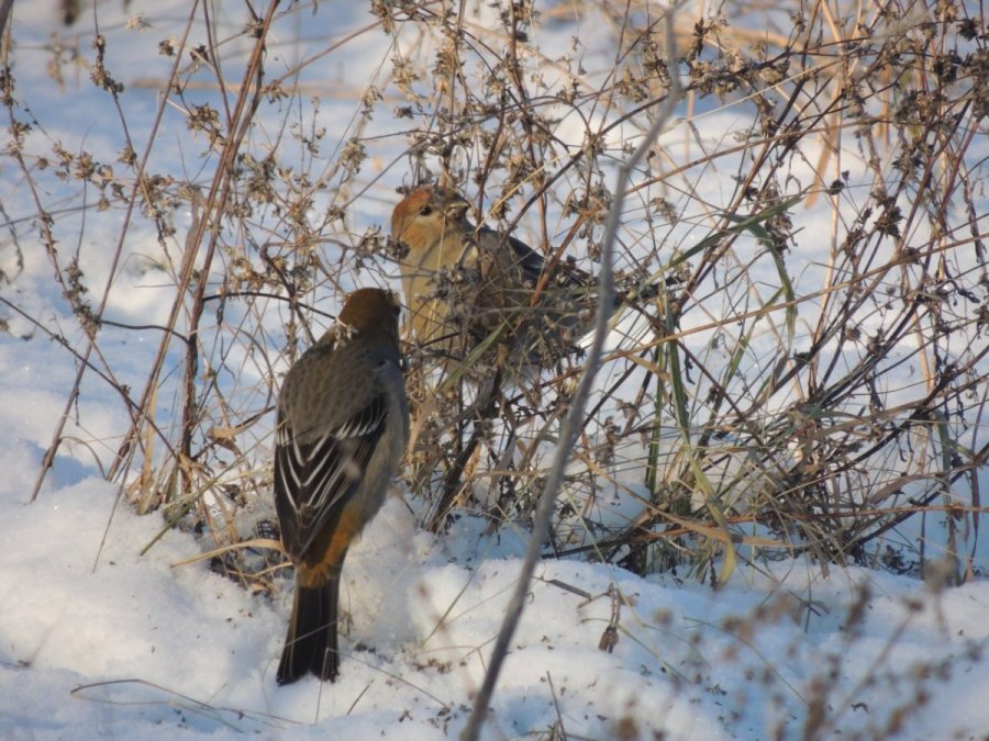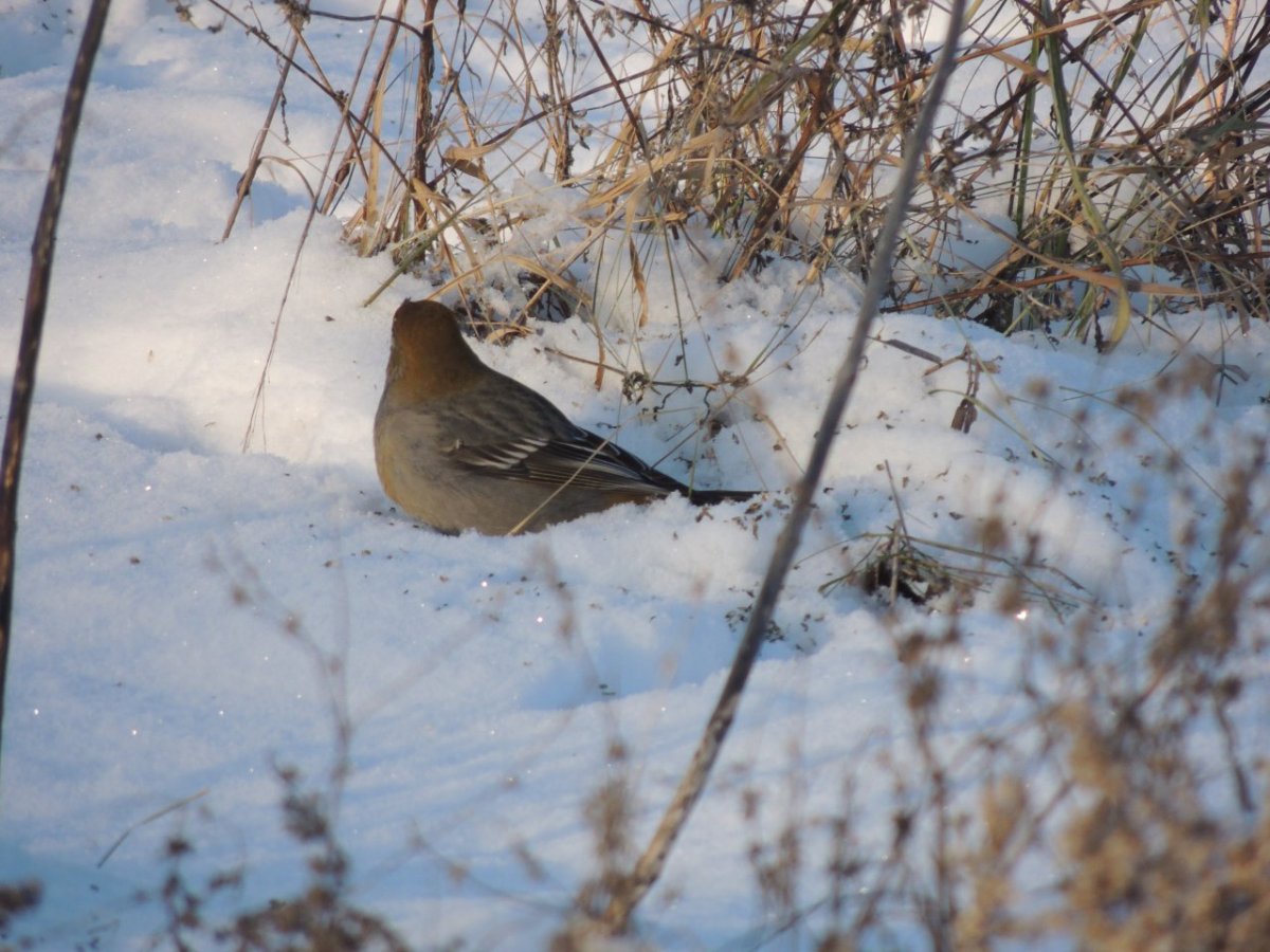 On marche sur le chemin lorsque l’on remarque quelques oiseaux colorés qui festoient sur le bord du chemin. Des herbes, des broussailles pleines de graines sortent de la neige. Ils picorent, creusent la neige, font des acrobaties, se bousculent pour se disputer leur pitance. J’ai fait quelques photos. Deux jours plus tard, plus d’oiseaux mais un rapace qui guette leur garde-manger pour se délecter de l’éventuel gourmand imprudent qui montrerait le bout de son bec…