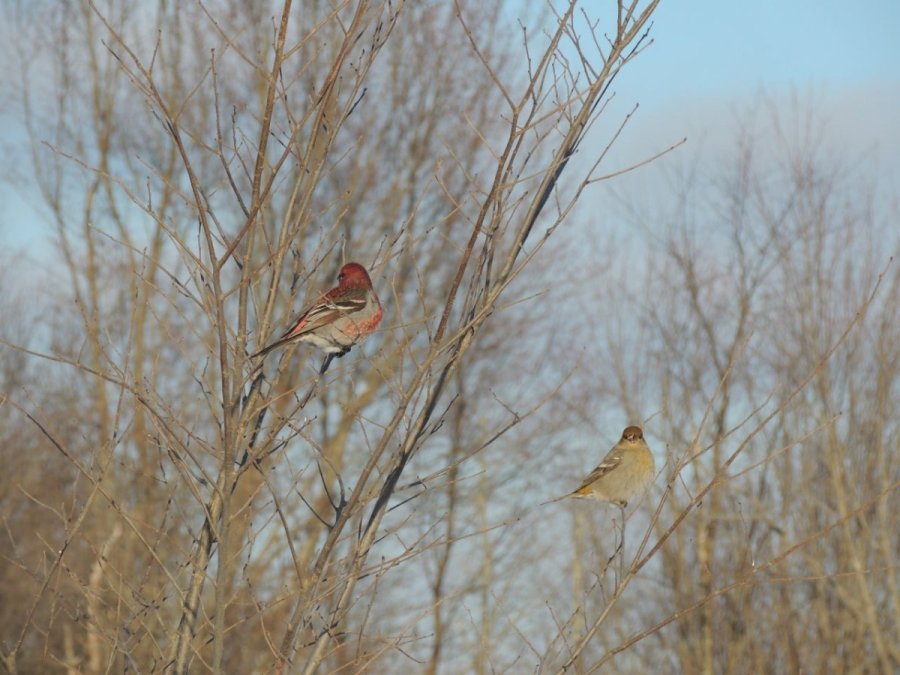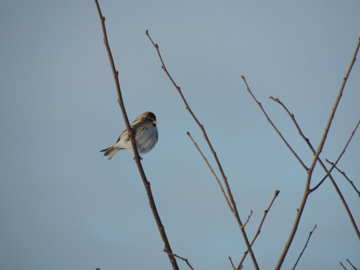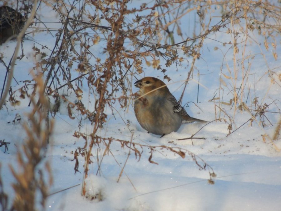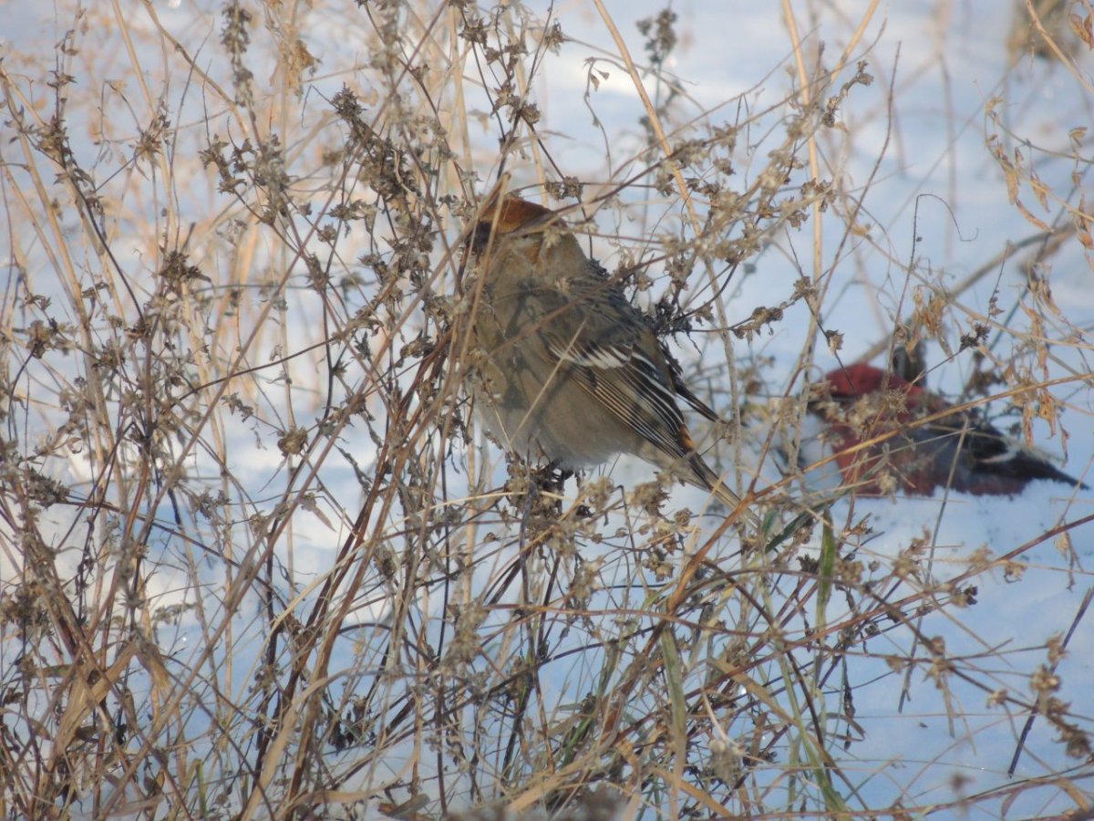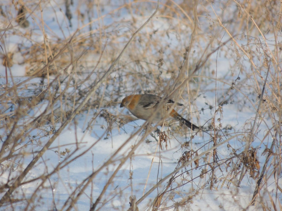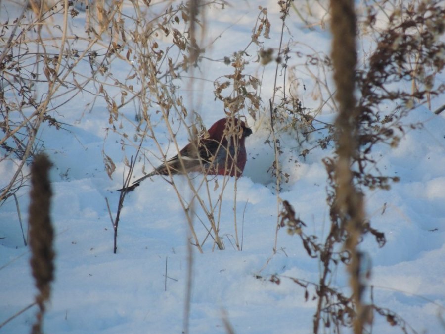 On marche sur le chemin lorsque l’on remarque quelques oiseaux colorés qui festoient sur le bord du chemin. Des herbes, des broussailles pleines de graines sortent de la neige. Ils picorent, creusent la neige, font des acrobaties, se bousculent pour se disputer leur pitance. J’ai fait quelques photos. Deux jours plus tard, plus d’oiseaux mais un rapace qui guette leur garde-manger pour se délecter de l’éventuel gourmand imprudent qui montrerait le bout de son bec…