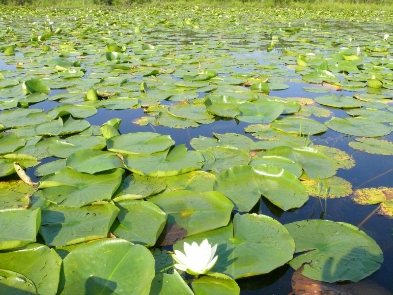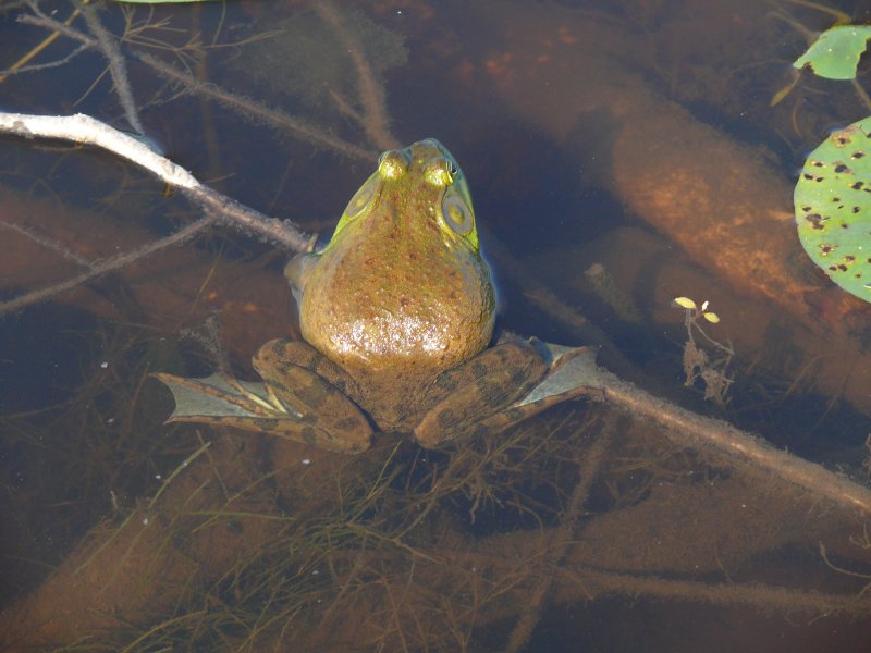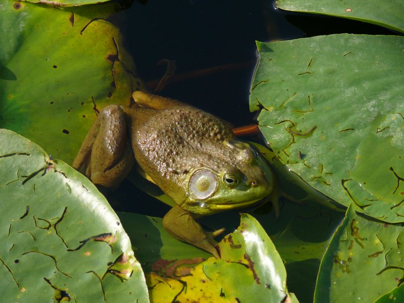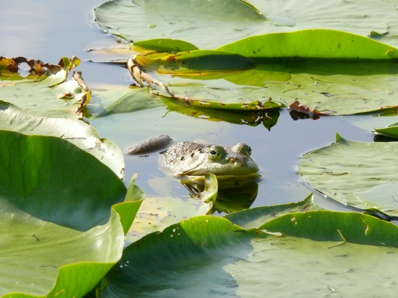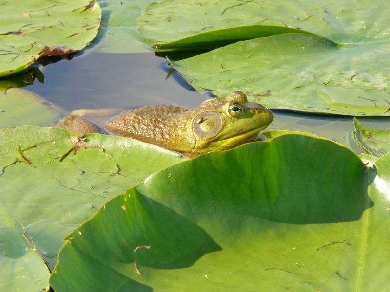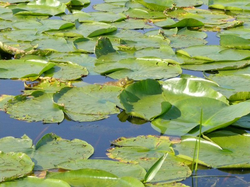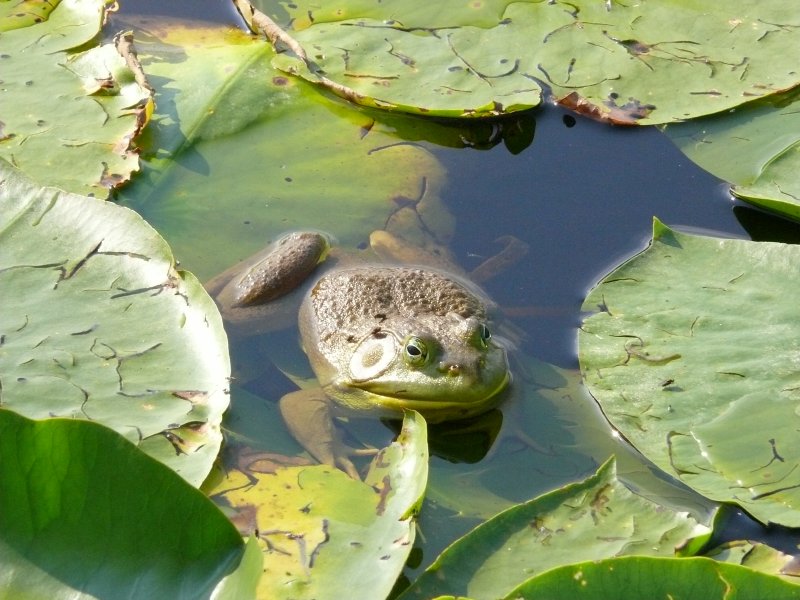 On peut donc, à condition d’être discret, observer facilement sur les tapis denses de plantes aquatiques ou de nénuphar des Ouaouarons et écouter leurs chants.