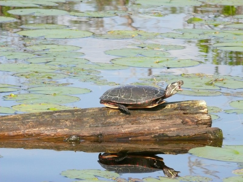 Nous passons à coté d’une tortue que nous réveillons. Elle baille avant de continuer son bain de soleil