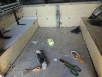 On a donc décider de nettoyer, dégraisser, reboucher les quelques trous dans la caisse, mettre de l’apprêt et ensuite deux coups de peinture identique à celle du toit.